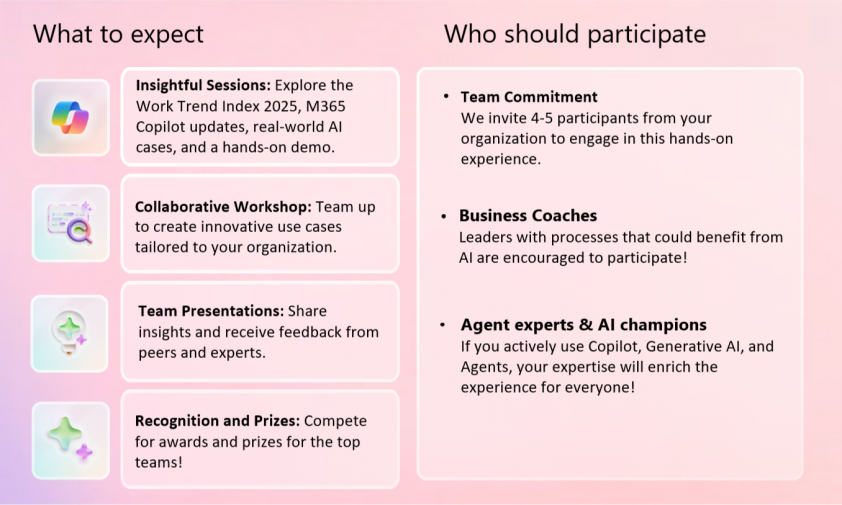 Are you ready to collaborate? This is a team competition where you and your colleagues can bring your ideas to life by building Agent use cases using Microsoft 365 Copilot Chat! Perfect for citizen developers with no coding or basic programming experience, this event offers practical exposure to AI agents. Prior AI experience is helpful but not required.